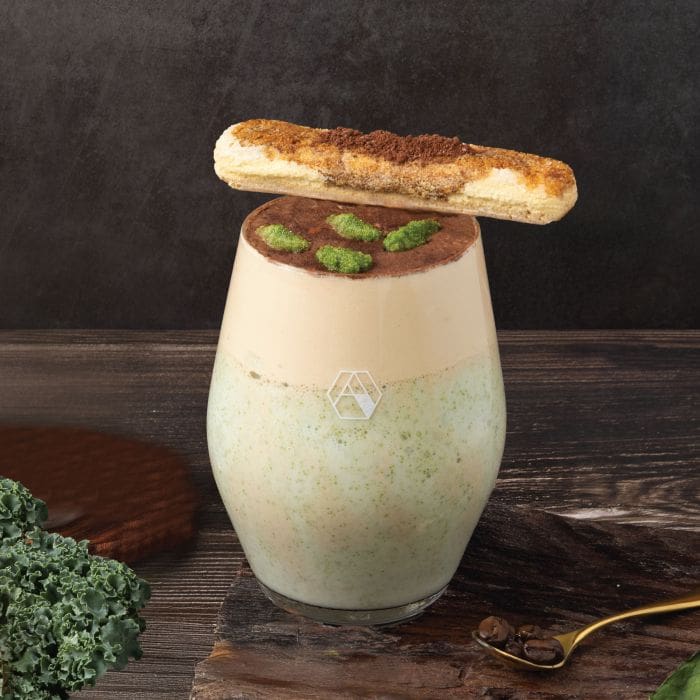 กรีนทีลาเต้สูตรพิเศษที่ผสมผสานโอ๊ตมิลค์กับเอสเปรสโซ คาราเมล และโยเกิร์ตสมูทตี้ ราดด้วยท็อปปิ้งทีรามิสุและไข่ผำ เติมความหวานนุ่มละมุนในรูปแบบเครื่องดื่มเพื่อสุขภาพ