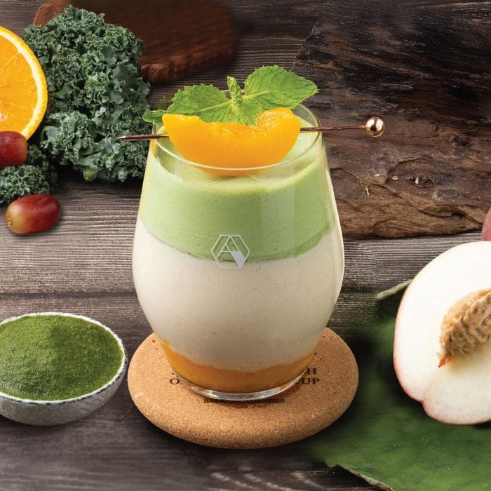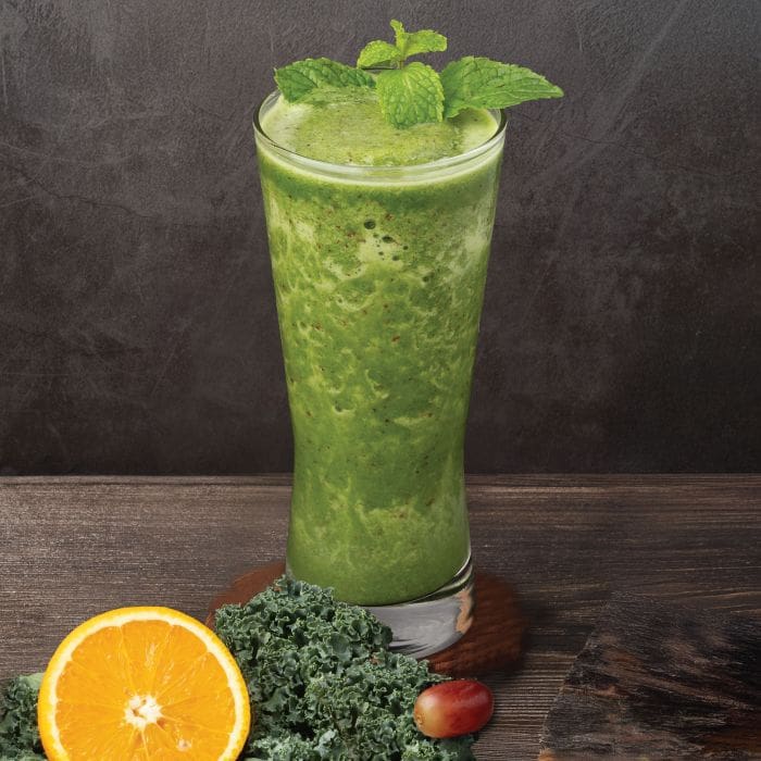 เครื่องดื่มสีเขียวสดใส รวมความเปรี้ยวหวานจากส้มซันคิสท์สด ผักเคล องุ่นแดง และโยเกิร์ตสมูทตี้ ปั่นรวมกับไข่ผำเพื่อสุขภาพ