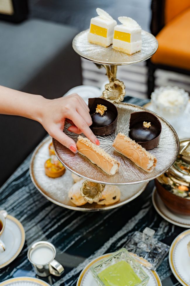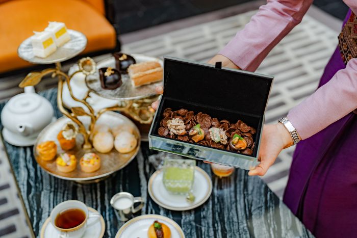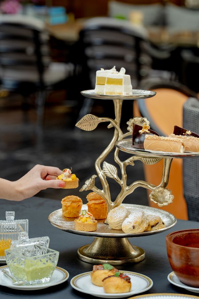 ต่อเนื่องความเพลิดเพลินด้วยของหวานชวนลิ้มลอง เริ่มจาก มินิโอเปร่าข้าวเหนียวมะม่วง นำเสนอหลากหลายชั้นความอร่อยแบบโอเปร่าเค้กสัญชาติฝรั่งเศสมาตีความใหม่ด้วยความอร่อยแสนโปรดปรานรสชาติไทย ทั้งชั้นเค้กสปันจ์เนื้อนุ่มสลับครีมเนียนละมุนและมูสมะม่วงสุกหอมหวาน เติมมิติด้วยองค์ประกอบข้าวเหนียวที่เสิรมมิติรสสัมผัสแปลกใหม่ ตามด้วย อองเทรเมต์ช็อกโกแลตชาไทย ที่นำความประณีตที่รับประทานได้ของละไมเค้กมูสช็อกโกแลตเข้มข้นผสานอินฟิวชันชาไทยอย่างละเมียด จนได้เป็นของหวานรสกลมกล่อม ลุ่มลึก และซับซ้อน สะท้อนการผสานตะวันออกและตะวันตกอย่างมีชั้นเชิง รวมทั้ง ทองม้วนไส้มะพร้าวครีมชีส ขนมไทยยอดนิยมที่ได้รับการตีความใหม่อย่างร่วมสมัย จากแป้งทองม้วนหอมกะทิกรุบกรอบ ห่อไส้มะพร้าวและครีมชีสเนื้อเนียนละมุนที่มอลรสหวานนุ่มนวลตัดเค็มอ่อนอย่างสมดุล ถ่ายทอดความคุ้นเคยในรูปแบบที่สง่างามและมีระดับ ก่อนปิดท้ายตามธรรมเนียมอันวิจิตรด้วยสโคนอบใหม่ เสิร์ฟคู่กับวิปครีมและเครื่องเคียงสูตรพิเศษ ไม่ว่าจะเป็น เคิร์ดสังขยาใบเตยมะนาว แยมมะม่วงขิง และ มาร์มาเลดส้มพริก ที่เติมเต็มเสน่ห์แบบไทยผสานกลิ่นอายตะวันตกให้กับประเพณีจิบน้ำชายามบ่ายได้อย่างไร้ที่ติ