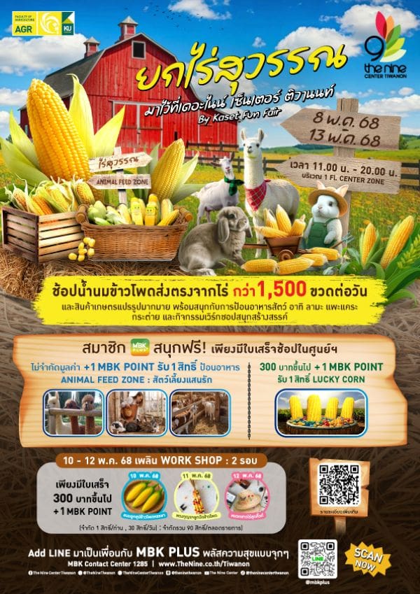 พร้อมสนุกกับกิจกรรมป้อนอาหารสัตว์เลี้ยงน่ารัก ไม่ว่าจะเป็น ลามะ แพะแคระ และกระต่าย พิเศษสำหรับสมาชิก MBK PLUS เพียงแสดงใบเสร็จช้อปหรืออิ่มในศูนย์ฯ ครบ 300 บาท + 1 MBK POINT สนุกกับกิจกรรมเวิร์กชอปสร้างสรรค์ อาทิการทำขนมลูกชุบข้าวโพดหรรษา การทำพวงกุญแจลูกปัดข้าวโพด การทำหมวกชาวไร่สุดคิ้วท์ และ รับฟรีของที่ระลึก LUCKY CORN ตั้งแต่วันพฤหัสบดีที่ 8 ถึงวันอังคารที่ 13 พฤษภาคม 2568 ณ บริเวณชั้น 1 ลานเซ็นเตอร์ โซน ศูนย์การค้าเดอะไนน์ เซ็นเตอร์ ติวานนท์