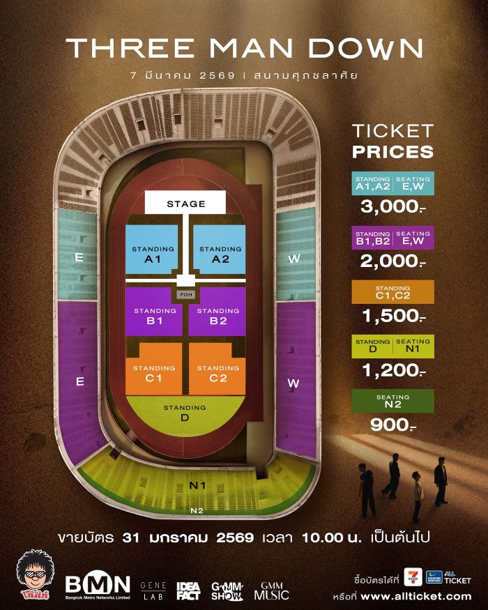 ถึงเวลาแล้วกับคอนเสิร์ต Three Man Down Live at สนามศุภชลาศัย วันที่ 7 มีนาคม 2569 เปิดจำหน่ายบัตรวันที่ 31 มกราคม 2569 เวลา 10.00 น. เป็นต้นไปที่ Counter Service All Ticket ในร้าน 7- Eleven หรือ www.allticket.com บัตรราคา 3,000 / 2,000 / 1,500 / 1,200 / 900 บาท สามารถติดตามรายละเอียดเพิ่มเติมได้ที่ รายละเอียดเพิ่มเติม facebook.com/