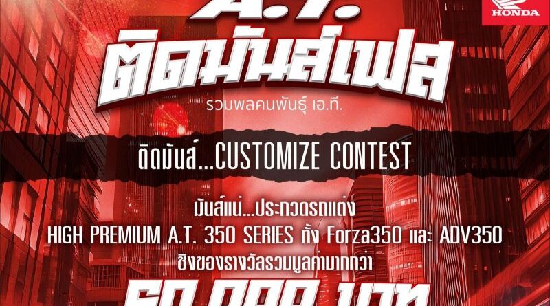 รถจักรยานยนต์ฮอนด้า ชวนสายคัสตอมมาปล่อยของในกิจกรรม “ติดมันส์ CUSTOMIZE CONTEST” เปิดเวทีให้เจ้าของรถจักรยานยนต์ฮอนด้าเอ.ที. ในคลาส 350 ซีซี ทั้ง 2 รุ่น ได้แก่ FORZA350 และ ADV350 ได้มาประชันรถแต่งสุดเฟี้ยว ประกวดชิงรางวัล Popular Vote รวมมูลค่ากว่า 60,000 บาท ภายในงาน “A.T. ติดมันส์เฟส” ที่จะจัดขึ้นในวันเสาร์ที่ 19 กรกฎาคม 2568 ณ ตลาดนัดเลียบด่วนแดนเนรมิต ตั้งแต่เวลา 16.00 – 21.00 น.