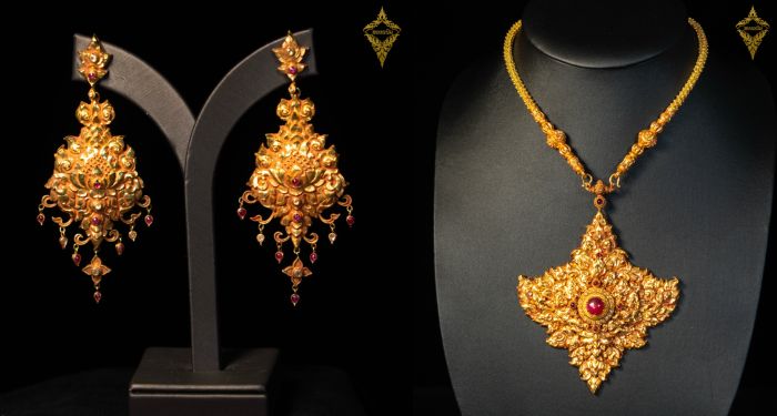 ถนิมพิมพาภรณ์ ในสำรับประกอบด้วย ทับทรวง สร้อยคอ ต่างหู กำไล แหวน และสร้อยข้อมือ แต่ละชิ้นล้วนถูกสร้างสรรค์ขึ้นอย่างมีเอกลักษณ์ รังสรรค์ด้วยกรรมวิธีแบบโบราณ ผสมผสานด้วยเทคนิคที่หลากหลาย ทั้งเทคนิคการสลักดุนแบบช่างทองหลวง เทคนิคการเดินลวดแบบอยุธยา เทคนิคการประดิษฐ์และประกอบไข่ปลา ผลงานล้วนประณีตและพิถีพิถัน