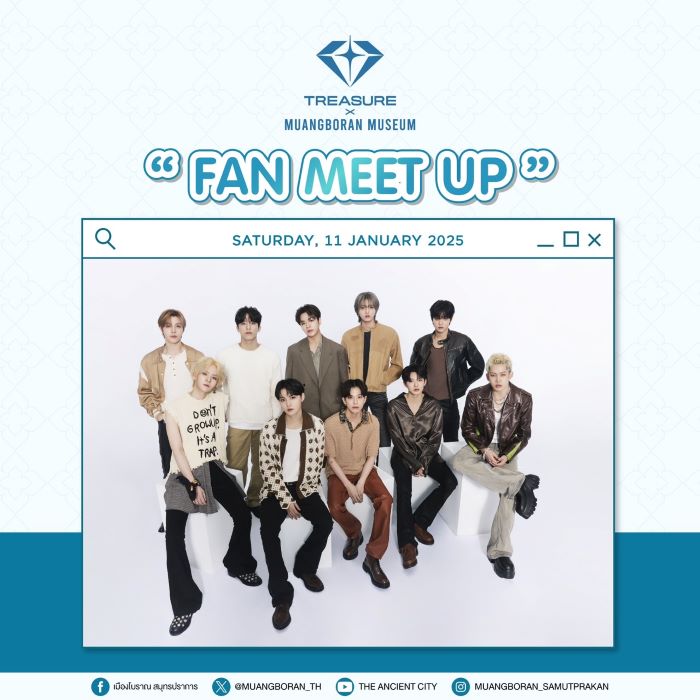 ไม่ทำให้ผิดหวัง หลังจากเมืองโบราณ พิพิธภัณฑ์เอกชนกลางแจ้งที่ใหญ่ที่สุดในโลกของมวลมนุษยชาติ ประกาศเปิดตัวแอมบาสเดอร์คือวง TREASURE ศิลปินเคป๊อปจากประเทศเกาหลีใต้ภายใต้สังกัดค่าย YG Entertainment ก็ประกาศกิจกรรมสุดพิเศษ TREASURE X MUANGBORAN จัดขึ้นในวันที่ 11 มกราคม 2568 ณ เมืองโบราณสมุทรปราการ อย่างต่อเนื่องเพื่อให้แฟนๆ ได้ลุ้นสิทธิ์เข้าร่วม Fan Meet Up กับ TREASURE และหวังให้ทุกคนได้รู้จักเมืองโบราณในมิติใหม่ที่สนุกกว่าเดิม