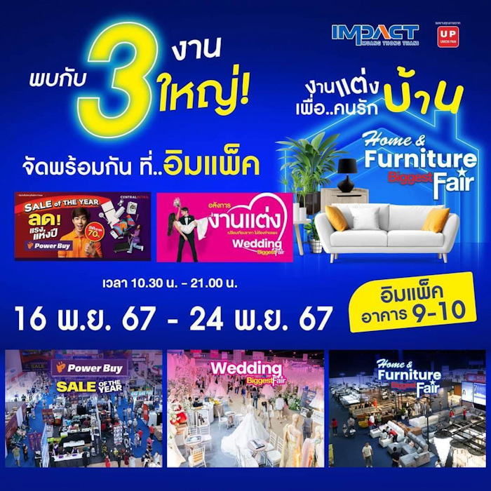 ยูเนี่ยนแพนฯ ผู้จัดงานแฟร์อิมแพ็ค กลับมาสร้างความฮือฮาอีกครั้ง กับการจัดมหกรรมงานแสดงสินค้า ที่ครั้งนี้ ขอเอาใจผู้บริโภคด้วยการทุบราคา ลดกระหน่ำ พร้อม ลด แลก แจก แถม กับโปรโมชั่นดีๆ มากมาย ลดสูงสุดถึง 70% ที่จะทำเอาทุกคนตะลึง กับงานใหญ่ส่งท้ายปี Home & Furniture Biggest Fair 2024 โดยจัดรวมกับงานใหญ่สำคัญ ๆ 2 งาน มาไว้บนพื้นที่เดียวกัน Power Buy Sale of The Year จาก ค่าย Power Buy และ Wedding Fair of The Year จัดขึ้นระหว่างวันที่ 16-24 พฤศจิกายน 2567 ณ อาคาร 9-10 อิมแพ็ค เมืองทองธานี โดยคาดว่าเงินสะพัดกว่า 300 ล้านบาท และมีผู้เข้าชมงานกว่า 100,000 คน