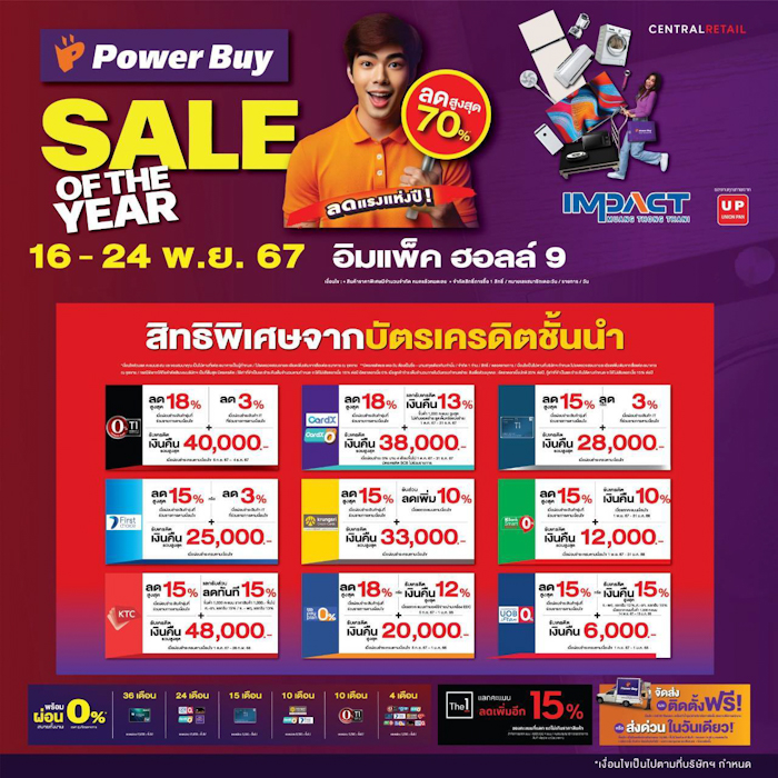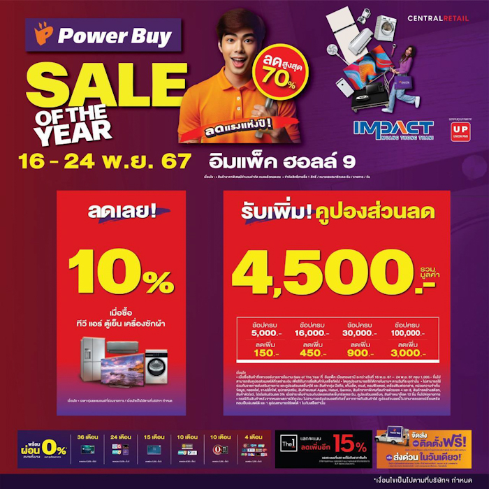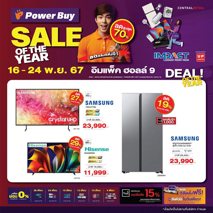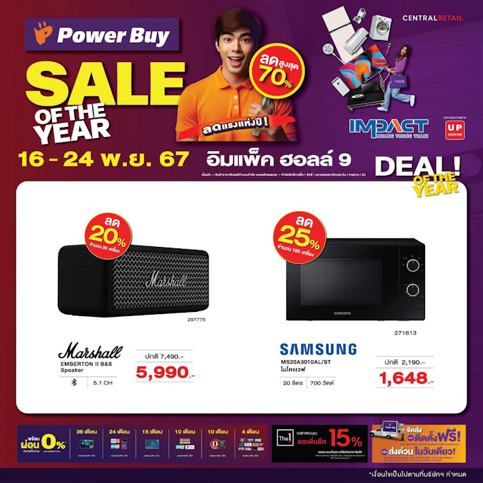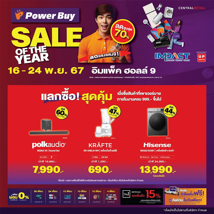 2. งาน Power Buy Sale of The Year ค่ายยักษ์ Power Buy นำเครื่องใช้ไฟฟ้ากว่า 30 แบรนด์ชั้นนำ มาร่วมจัดโปรโมชั่น แต่ยังนำสินค้า ฮอตไอเท็ม แกะกล่องรุ่นใหม่ ทุบราคา ลดแรงแห่งปี และ เครื่องใช้ไฟฟ้า ที่เป็นไฮไลท์ของปี มาลดราคาทิ้งทวนส่งท้ายปี สูงสุด 70% พร้อมโปรโมชั่น ผ่อน 0% สูงสุด 36 เดือน พร้อมบริการจัดส่ง และติดตั้งฟรี หรือแลกซื้อ สุดคุ้ม เมื่อซื้อสินค้าที่เพาเวอร์บาย ภายในงานครบ 999 ขึ้นไป อาทิ Sound Bar ปกติราคา 19,990 ลดเหลือ 7,990 บาท, เครื่องปั่นน้ำผลไม้ KRAFTE ปกติราคา 1,290 ลดเหลือ 690 บาท, เครื่องซักผ้า Hisense ปกติราคา 24,990 ลดเหลือ 13,990 บาท, ทีวี Samsung ปกติราคา 32,990 ลดเหลือ 23,990 บาท, ตู้เย็น Samsung ปกติราคา 29,490 ลดเหลือ 23,990 บาท