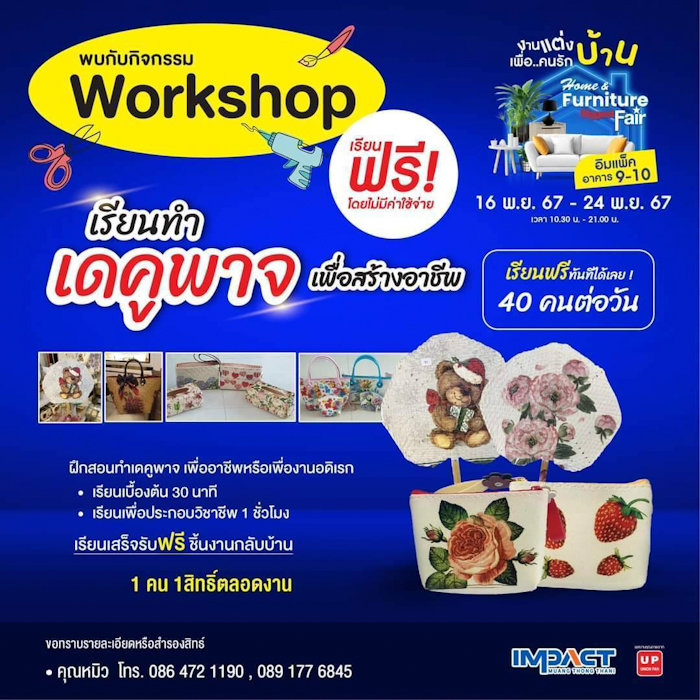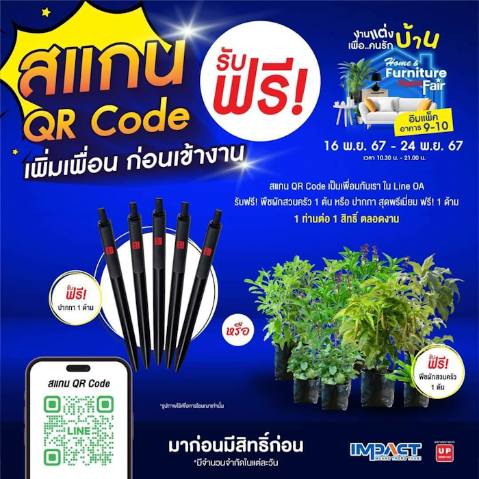 ภายในงานครั้งนี้ เมื่อซื้อสินค้าภายในงานมูลค่าตั้งแต่ 3,000 บาทขึ้นไป รับของสมนาคุณฟรี มูลค่ารวมกว่า 220,000 บาท, Workshop เรียนทำเดคูพาจ เพื่อสร้างอาชีพ ฟรีไม่มีค่าใช้จ่าย, สแกน QR Code เพิ่มเพื่อน ก่อนเข้างาน รับฟรี พืชผักสวนครัว หรือปากกาสุดพรีเมี่ยม