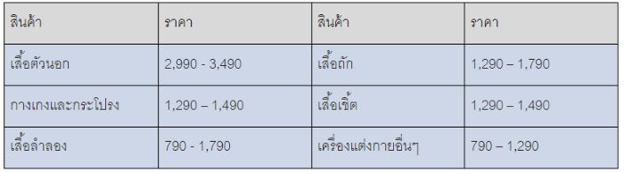 ไลน์อัพประกอบไปด้วย 12 ไอเทมสำหรับผู้หญิง 12 ไอเทมสำหรับผู้ชาย และ 2 ไอเทมสำหรับเครื่องแต่งกายอื่นๆ โดยเสื้อผ้าส่วนใหญ่ถูกออกแบบให้ใส่ได้ทั้งผู้หญิงและผู้ชาย
