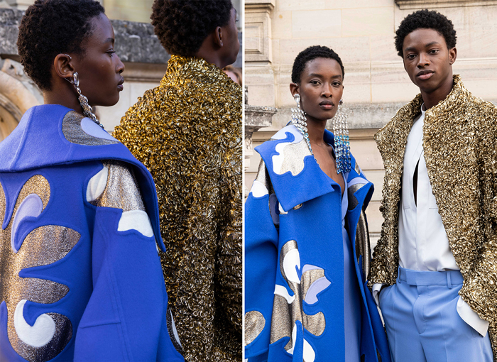 และในทางกลับกัน ความทันสมัยสามารถกลายเป็นความโดดเด่นเช่นกัน ไม่ว่าจะเป็น เสื้อยืดที่เปลี่ยนโฉมเป็นเสื้อคลุมยาว กางเกงยีนส์วินเทจ Levi’s® 501 XX Big E ที่ทำหน้าที่เป็นผืนผ้าสำหรับงานถักทอสีทอง อีกทั้งกางเกงยีนส์อื่นๆ ถูกรังสรรค์ขึ้นใหม่ ด้วยผ้าเดนิมที่ใช้เทคนิค trompe l’oeil หรือภาพลวงตาที่แฝงมากับลวดลายบนผืนผ้า ด้วยการร้อยลูกปัดที่ใช้ความประณีตและเพิ่มความน่าค้นหา ซึ่งต้องดูรายละเอียดอย่างใกล้ชิดจึงจะเข้าใจแนวทางและปรัชญาของคอลเล็กชั่นนี้ ในขณะเดียวกัน ความล้ำค่าเกิดขึ้นได้ในทุกๆวัน การเฉลิมฉลองของความสวยงาม ความเสมอภาคและหลีกเลี่ยงการแบ่งแยกลำดับชั้นในสังคม