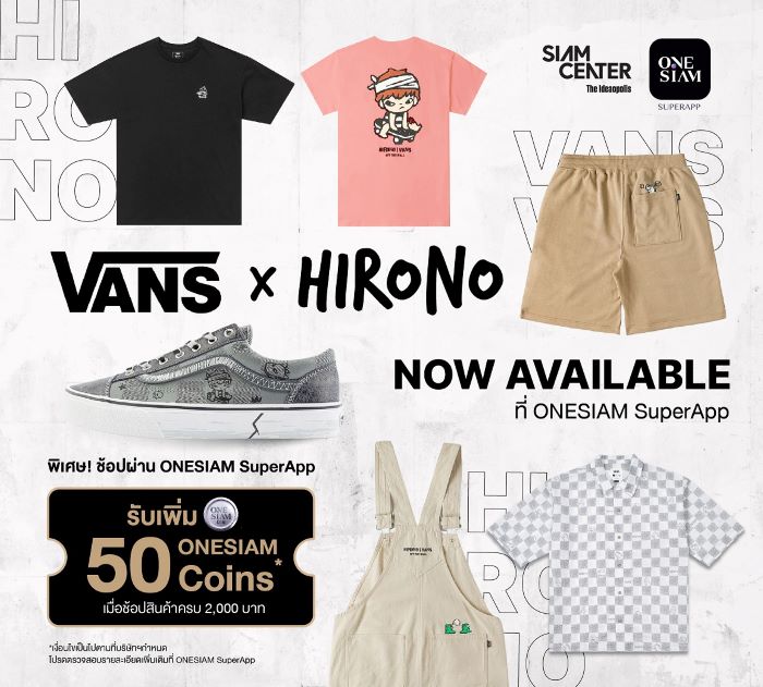 คอลเลคชั่น Vans X Hirono วางจำหน่ายในวันศุกร์ที่ 5 กรกฎาคมนี้ ที่ Vans Flagship Store ชั้น G สยามเซ็นเตอร์ และพิเศษเมื่อช้อปผ่าน ONESIAM SuperApp รับเพิ่ม 50 ONESIAM Coins เมื่อช้อปสินค้าครบ 2,000 บาท