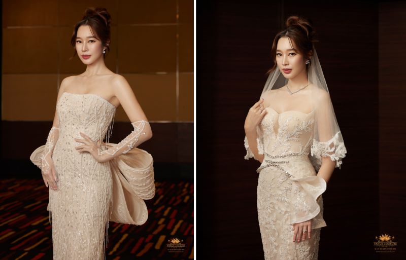 ชุดเมอเมดลุคที่ 2 ชุดที่งดงามเหนือกาลเวลาในโทนเฉดสีแชมเปญอีกเช่นกัน ที่สื่อถึงความหรูหราและอ่อนโยน โดดเด่นด้วยงานปักคริสตัลงานทำมือทั้งชุดที่ทำอย่างพิถีพิถัน เพื่อเพิ่มประกายแวววาวให้ทุกการเคลื่อนไหว ความโดดเด่นของชุดนี้อยู่ที่ทรง “เกาะอกสวีทฮาร์ท” หรือทรงหัวใจ ที่ช่วยเน้นช่วงคอและไหล่ให้ดูอ่อนโยนและโรแมนติก พร้อมทั้งยังมีดีเทลพิเศษที่ขอบเอวที่เพิ่มดีไซน์ให้มีระบายแบบคงรูปที่ช่วยสร้างมิติให้กับลุคเจ้าสาวดูโดดเด่นงดงาม
