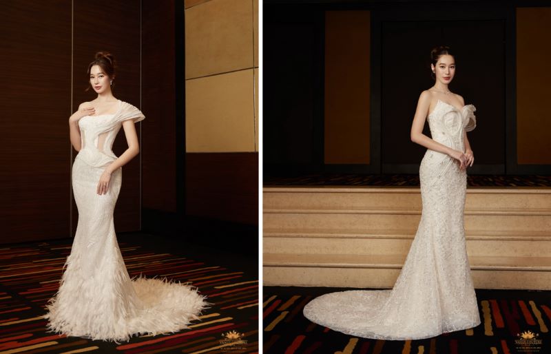 ชุดเมอเมดลุคที่ 3 สีขาวออฟไวท์อันบริสุทธิ์ สื่อถึงความงามที่แสนสงบและอ่อนโยนในขณะเดียวกันก็แฝงความหรูหราในทุกองค์ประกอบเหมาะสำหรับเจ้าสาวที่ต้องการความโดดเด่นและความมั่นใจในวันพิเศษของพวกเธอ ตัดเย็บด้วยความละเอียดประณีต พร้อมการปักคริสตัลงานทำมือที่สะท้อนประกายวิจิตร ชุดนี้โดดเด่นด้วยการออกแบบโอบไหล่แบบเกาะอกที่คงรูปสวยงาม โครงสร้างเฉพาะที่ช่วยโอบอุ้มให้ชุดมีความสมดุลและมั่นคง พร้อมดีเทลที่ลักษณะคล้ายโบที่โอบรอบต้นแขน ช่วยปกปิดและเสริมความมั่นใจให้กับเจ้าสาวได้อย่างสมบูรณ์แบบ
