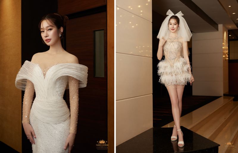 ปิดท้ายด้วยชุดเดรสสั้นอาฟเตอร์ปาร์ตี้สีขาวแชมเปญสุดหรูหรา ที่ออกแบบมาเพื่อให้เจ้าสาวได้เปล่งประกายในค่ำคืนอันแสนพิเศษ ปักด้วยคริสตัลงานทำมือทั้งชุด สะท้อนแสงไฟและความงามในทุกมุมมอง เกาะอกทรงหัวใจช่วยเสริมเสน่ห์และความโรแมนติกให้กับลุคของเจ้าสาว ความโดดเด่นของ ชุดนี้คือดีไซน์ซีทรูที่แนบเนื้อ เซ็กซี่แกมน่ารัก ผสมผสานกับกระโปรงสั้นประดับด้วยขนนกที่ดีดเด้งอย่างหรูหรา โครงสร้างเฉพาะของชุดช่วยให้การออกแบบไหล่และเกาะอกคงรูปได้อย่างลงตัว พร้อมเน้นรูปร่างของเจ้าสาวให้ดูสวยเพรียวได้อย่างสมบูรณ์แบบ