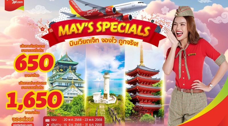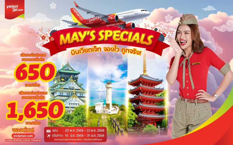 เตรียมออกเดินทางกับเวียตเจ็ทไทยแลนด์ในสุดคุ้ม ด้วยโปรโมชั่น “บินเวียตเจ็ท จองไว ถูกจริง! (May’s Specials)” เสนอบัตรโดยสารราคาพิเศษ เริ่มต้นเพียง 650 บาท (ราคารวมภาษีและค่าธรรมเนียม) สำหรับเดินทางบนเครือข่ายเส้นทางบินภายในประเทศ อาทิ เชียงใหม่ ภูเก็ต หาดใหญ่ และอีกมากมาย และราคาเริ่มต้นเพียง 1,650 บาท (ราคารวมภาษีและค่าธรรมเนียม) สำหรับเส้นทางระหว่างประเทศของเวียตเจ็ทไทยแลนด์ อาทิ ไทเป ฟูกุโอกะ ฟูโกว๊ก ปักกิ่ง และเซี่ยงไฮ้ รวมถึงอีกกว่า 10 เส้นทาง สามารถสำรองบัตรโดยสารได้ระหว่างวันที่ 20 – 23 พฤษภาคม 2568 ใช้เดินทางได้ระหว่างวันที่ 16 มิถุนายน – 31 ธันวาคม 2568 (ยกเว้นวันหยุดนักขัตฤกษ์) ที่ www.vietjetair.com ผู้โดยสารที่ต้องการเดินทางในช่วงเดือนมิถุนายนและกันยายน มีที่นั่งราคาโปรฯ เพียบ จองได้เลยตอนนี้!