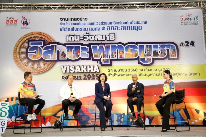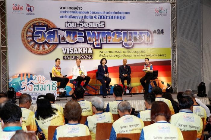 เมื่อวันที่ 24 เมษายน 2568 ที่อาคารศูนย์เรียนรู้สุขภาวะ กรุงเทพฯ นางสาวนิรมล ราศรี ผู้อำนวยการสำนักส่งเสริมวิถีชีวิตสุขภาวะ (สำนัก 5) สำนักงานกองทุนสนับสนุนการสร้างเสริมสุขภาพ (สสส.) กล่าวว่า สสส. มุ่งส่งเสริมให้ประชาชน หันมาใส่ใจสุขภาพกายและใจควบคู่กับการถือศีล 5 และละเว้นอบายมุข ซึ่งเป็นแนวทางในการดำเนินชีวิตอย่างมีสติ มีสมาธิและมีคุณธรรม อันจะนำไปสู่สังคมที่สงบสุขและยั่งยืน เนื่องในวันวิสาขบูชาซึ่งเป็นวันสำคัญทางพระพุทธศาสนาและร่วมส่งเสริมคุณธรรมจริยธรรมในสังคมไทย กระทรวงวัฒนธรรม สสส. จึงได้ร่วมกับ มูลนิธิสมาพันธ์ชมรมเดิน-วิ่งเพื่อสุขภาพไทย และภาคีเครือข่ายจัดกิจกรรม “เดิน วิ่งสมาธิ วิสาขะ พุทธบูชา ถือศีล ๕ ลด ละ อบายมุข” ปี 2568 ซึ่งจัดติดต่อกันครั้งที่ 24 พร้อมกันกว่า 73 สนามทั่วประเทศ ในวันที่ 11 พฤษภาคม 2568 เวลา 05.30 น.