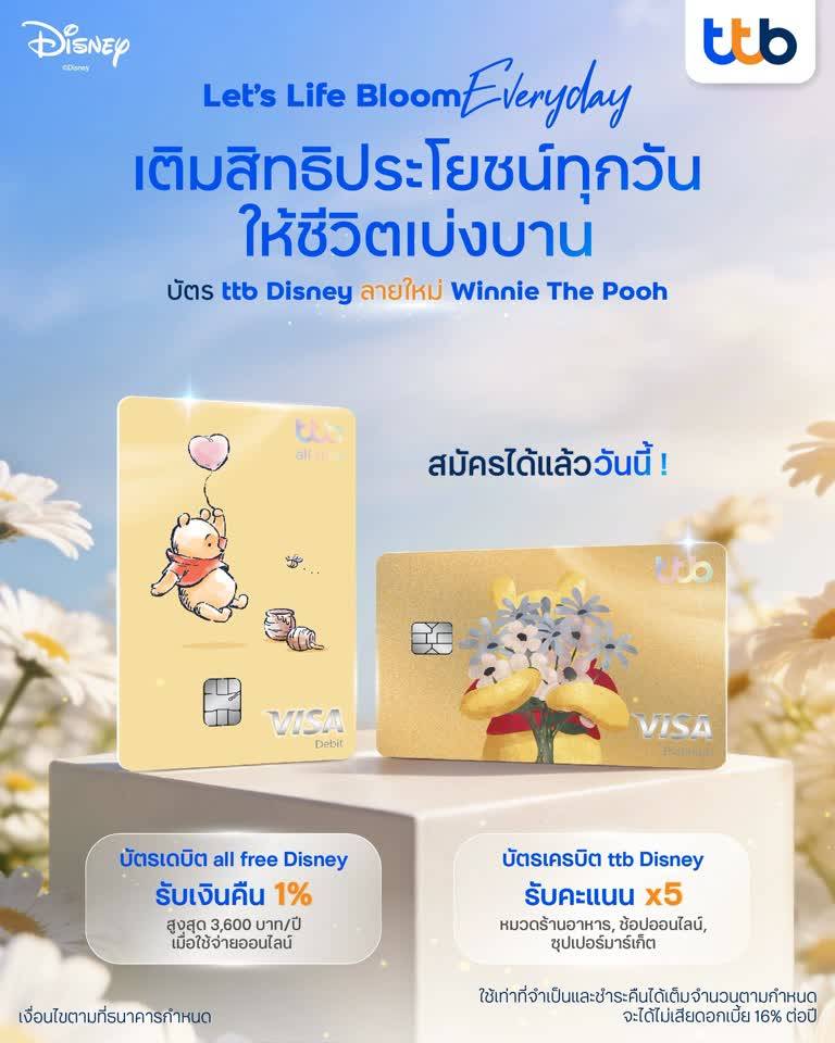 ทีทีบี เปิดตัวดีไซน์หน้าบัตรลายใหม่ “หมีพูห์” ทั้งบัตรเดบิต ttb all free Disney ลาย “Winnie the Pooh” และบัตรเครดิต ttb Disney ลาย “Pooh Blooms” พร้อมเติมความน่ารักให้ทุกไลฟ์สไตล์การใช้จ่ายกับ e-Slip 3 ดีไซน์ใหม่ ควบคู่สิทธิประโยชน์และโปรโมชันพิเศษครบครัน โดยผู้ที่สนใจสามารถสมัครบัตรเดบิต ttb all free Disney และบัตรเครดิต ttb Disney ได้ที่แอปพลิเคชัน ttb touch และเว็บไซต์ทีทีบี หรือที่ทีทีบีทุกสาขา