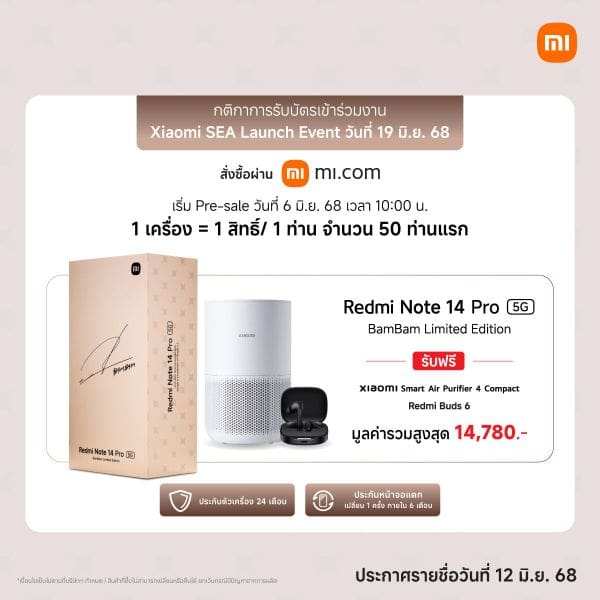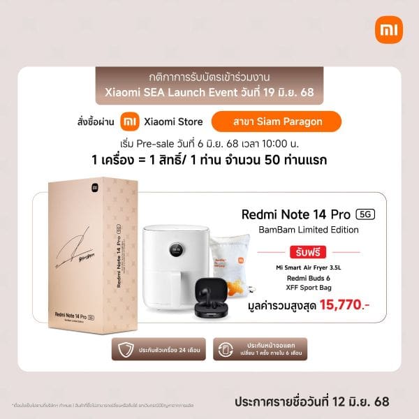 สมาร์ทโฟน Redmi Note 14 Pro 5G BamBam Limited Edition พร้อมให้คุณเป็น 1 ใน 100 ท่านเพื่อเป็นเจ้าของก่อนใคร โดยสามารถสั่งซื้อล่วงหน้าในระหว่างวันที่ 6-11 มิถุนายน 25681 ในราคาพิเศษ 10,990 บาท (จากราคาปกติ 11,990 บาท) ผ่านช่องทางจำหน่ายที่ร้าน Xiaomi Store สาขาสยามพารากอน หรือช่องทางออนไลน์ mi.com เท่านั้น โดยลูกค้า 50 ท่านแรกที่สั่งซื้อสินค้าผ่านร้าน Xiaomi Store สาขาสยามพารากอน รับของสมนาคุณฟรี ได้แก่ หูฟัง Redmi Buds 6, หม้อทอดไร้น้ำมัน Mi Smart Air Fryer 3.5L และกระเป๋า XFF Sport Bag พร้อมรับประกันตัวเครื่อง 24 เดือน3 และประกันหน้าจอแตก (เปลี่ยน 1 ครั้ง ภายใน 6 เดือน)4 รวมมูลค่า 15,770 บาท2 ในขณะที่ลูกค้า 50 ท่านแรกที่สั่งซื้อสินค้าผ่านช่องทางออนไลน์ mi.com รับของสมนาคุณฟรี ได้แก่ หูฟัง Redmi Buds 6 และเครื่องฟอกอากาศ Xiaomi Smart Air Purifier 4 Compact พร้อมรับประกันตัวเครื่อง 24 เดือน3 และประกันหน้าจอแตก (เปลี่ยน 1 ครั้ง ภายใน 6 เดือน)4 รวมมูลค่า 14,780 บาท2 นอกจากนี้ ลูกค้าทั้ง 100 ท่าน2 (50 ท่านจากการซื้อผ่าน Xiaomi Store สาขาสยามพารากอน และ 50 ท่านจากการซื้อผ่าน mi.com) จะได้รับสิทธิ์เข้าร่วมงาน Xiaomi SEA Launch Event ซึ่งจะจัดขึ้นในวันที่ 19 มิถุนายน 2568 อีกด้วย2