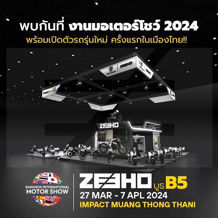 บริษัท พยัคฆ์ มอเตอร์ จำกัด ผู้นำเข้า ประกอบ และจัดจำหน่ายรถจักรยานยนต์ไฟฟ้าชั้นนำ แบรนด์ ZEEHO เตรียมขนทัพรถจักรยานยนต์ไฟฟ้า เอาใจคนรักษ์โลก ในงาน บางกอก อินเตอร์เนชั่นแนล มอเตอร์โชว์ ครั้งที่ 45 หรือ มอเตอร์โชว์ 2024 (Motor Show 2024) พร้อมเปิดตัวมอเตอร์ไซค์ไฟฟ้า ZEEHO AE2 และ ZEEHO City Sport ในราคาโปรโมชั่นสุดพิเศษและรับของสมนาคุณมากมาย และเปิดตัว Concept EV Bike, ZEEHO AE6SE และ ZEEHO AE8SE
